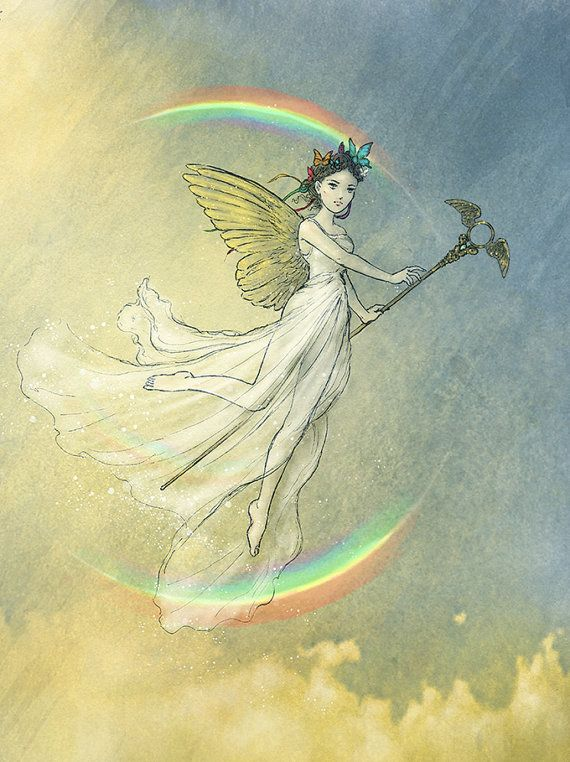 The goddess Iris, the speedy and chief divine messenger of the gods and goddesses, travels the rainbow to deliver the will and wishes of the gods.